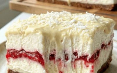 Kocham to ciasto 😍 Chrupiący spód, lekka kremowa masa, orzeźwiające maliny i ta obłędna polewa z wiórkami kokosowymi... Rozpływa się w ustach, a do tego nie rujnuje diety! 🤤