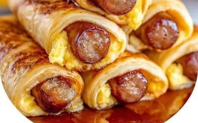 Śniadaniowe parówki w cieście francuskim Składniki 1 puszka schłodzonego ciasta rogalikowego (lub domowego ciasta biszkoptowego) 8 kiełbasek śniadaniowych (wieprzowych, drobiowych…