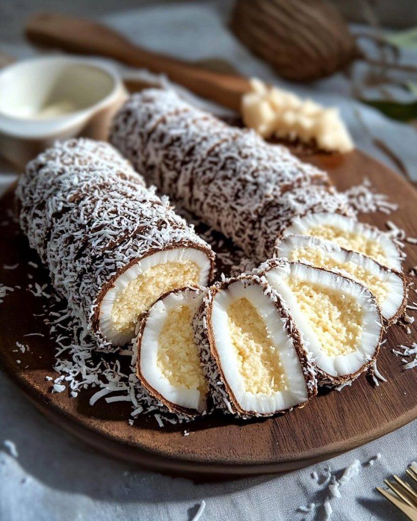 Formowanie roladek: Na powierzchni blatu lub deski rozłóż cienką warstwę przygotowanego kokosa z pierwszego kremu. Na każdej porcji uformuj małe roladki, a następnie ostrożnie przełóż je na talerz.