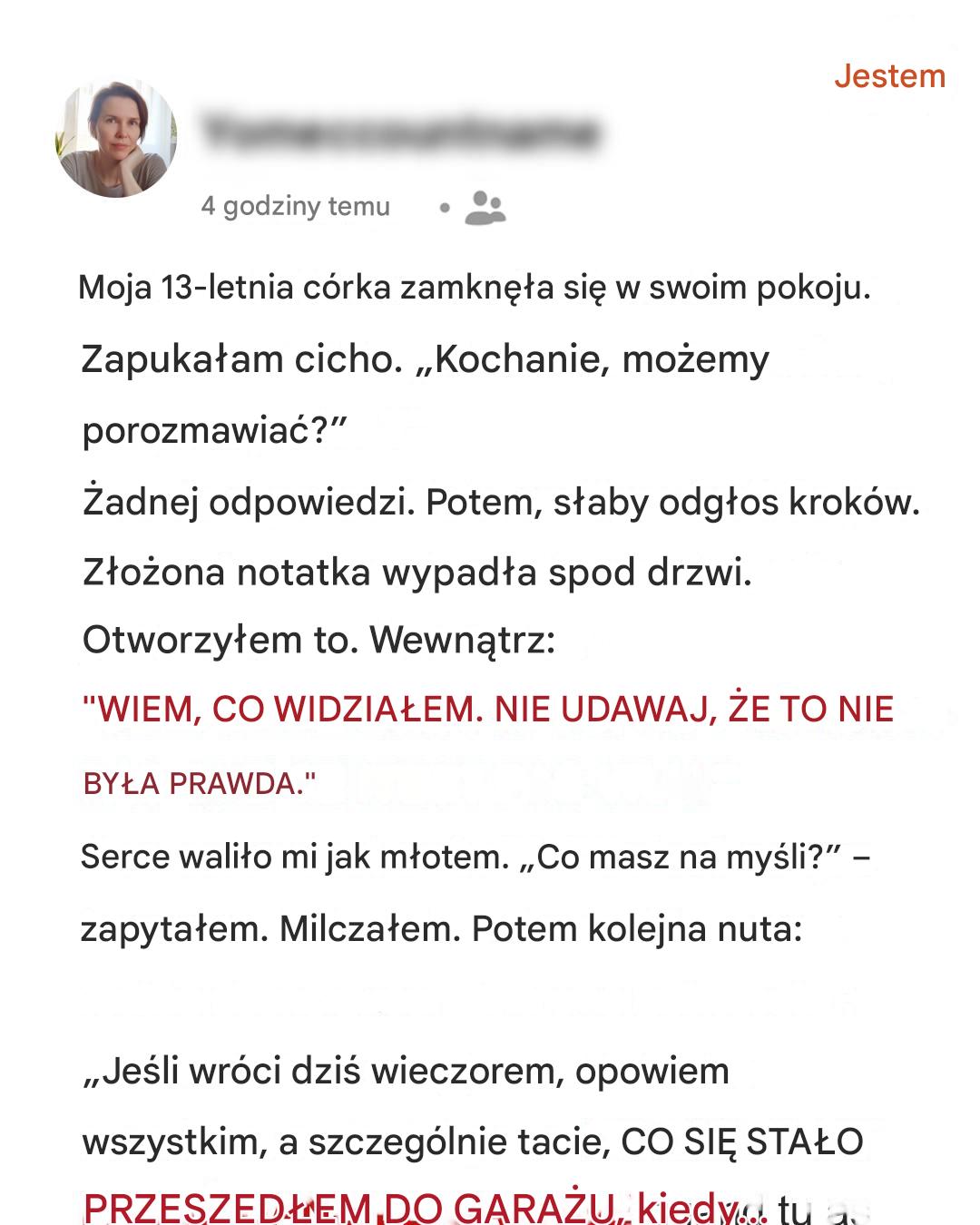 „Nie mogę czegoś naprawić, jeśli nie wiem, co jest zepsute” – powiedziałam, opierając czoło o chłodne drewno. „Zawsze potrafiliśmy o tym rozmawiać, pamiętasz? Nawet kiedy w zeszłym roku stłukłeś mój ulubiony wazon? Nie byłam wtedy zła i nie będę teraz”.