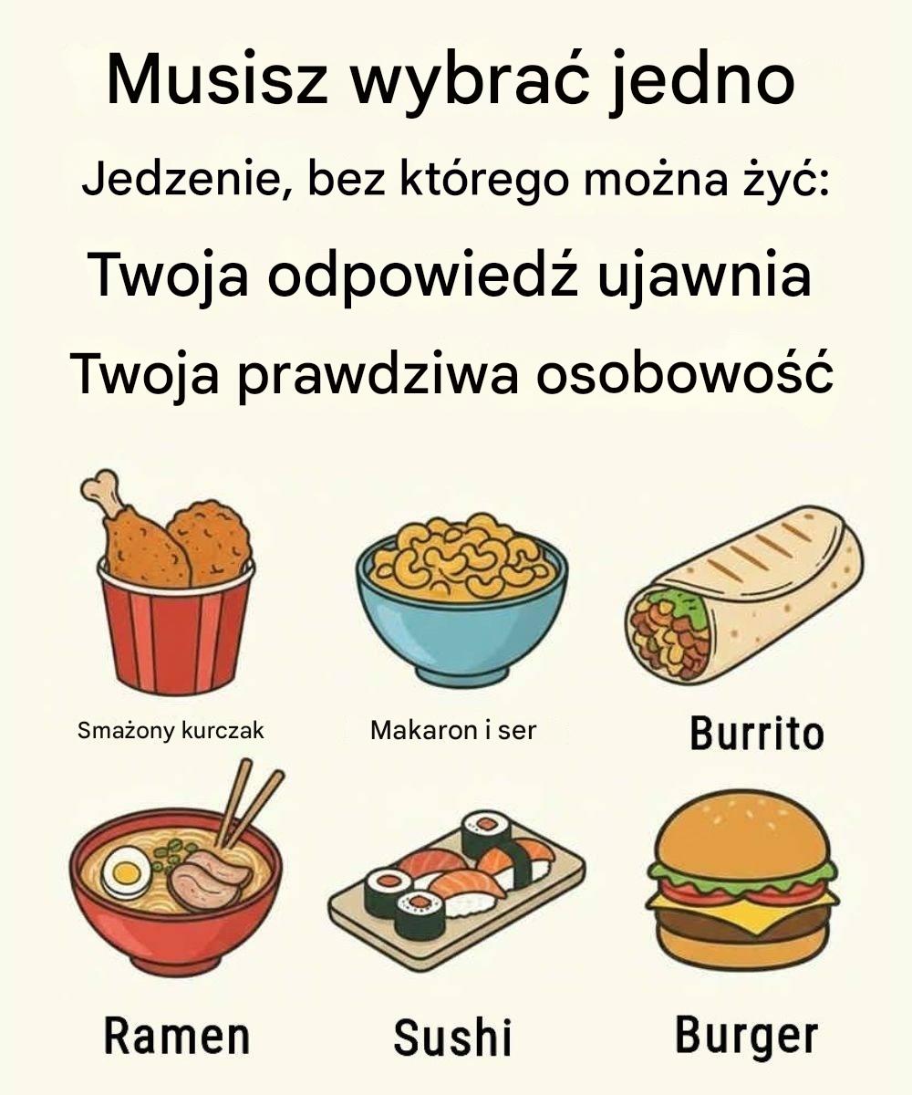 Jeśli smażony kurczak to jedzenie, z którego mógłbyś zrezygnować, prawdopodobnie jesteś osobą praktyczną i zdyscyplinowaną. Lubisz sobie dogadzać, ale nie jesteś od tego uzależniony. Rozumiesz, że dobre rzeczy nie zawsze muszą być stałe, aby je docenić. Jesteś typem osoby, która potrafi odwlekać gratyfikację, tworzyć długoterminowe plany i trzymać się ich – nawet gdy pojawia się pokusa. Komfort jest dla ciebie ważny, ale kontrola jest ważniejsza.