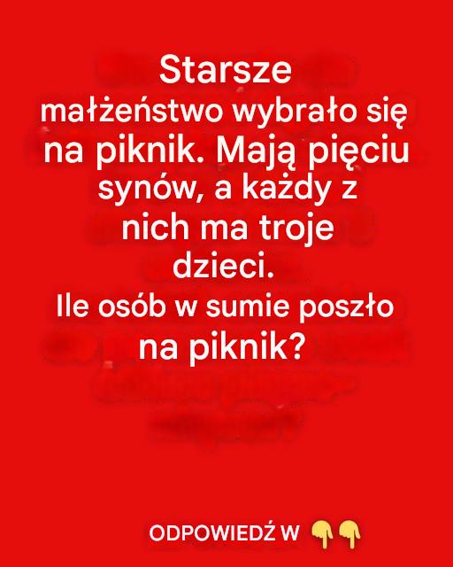 Dzisiejsza zagadka to prawdziwy hit w mediach społecznościowych. Przedstawia pozornie prostą sytuację, uzupełnioną szybkim obliczeniem: „Starsza para wybrała się na piknik. Mają pięciu synów, a każdy z nich ma troje dzieci. Ile osób w sumie było na pikniku?”. Pytanie, które, choć pozornie niegroźne, wciąż zaskakuje wielu internautów.