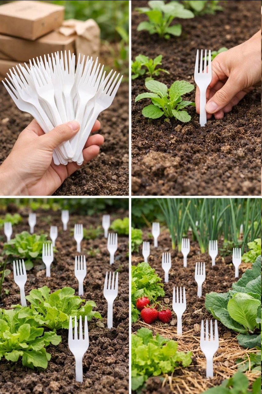 Właśnie tu pojawia się ten zaskakujący pomysł: wbijanie plastikowych wideł w glebę, zębami do góry, wokół najdelikatniejszych roślin.