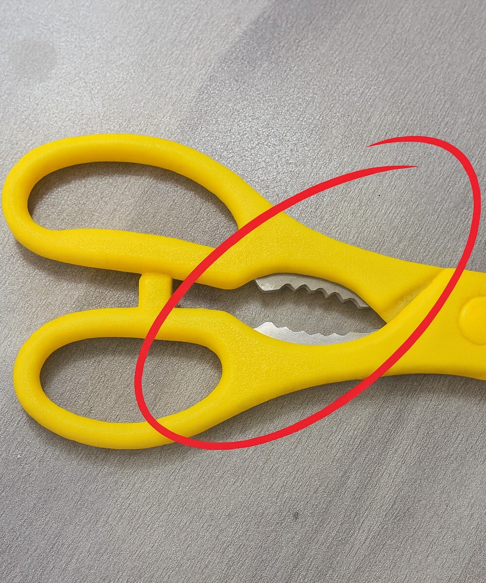 Przyjrzyj się bliżej swoim nożyczkom kuchennym. Pomiędzy dwoma ostrzami, gdzie naturalnie spoczywają Twoje palce, znajduje się rowkowana część. Po lekkim zamknięciu uchwytów, ząbki idealnie się zazębiają.