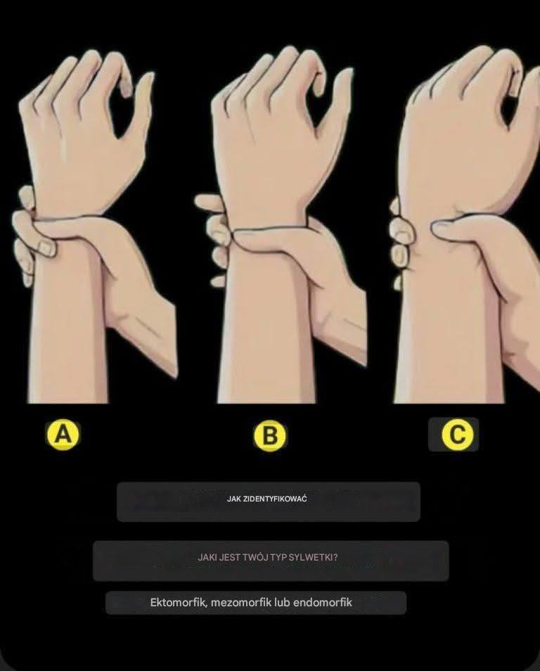 A – Ektomorfik: Kciuk i palec środkowy znacznie zachodzą na siebie, gdy owijasz nadgarstek wokół drugiej dłoni. Ten typ sylwetki charakteryzuje się zazwyczaj cienkimi kośćmi, długimi kończynami i trudnościami z przybieraniem na wadze lub masą mięśniową. ⏬️⏬️ Kontynuuj na następnej stronie ⏬️⏬️