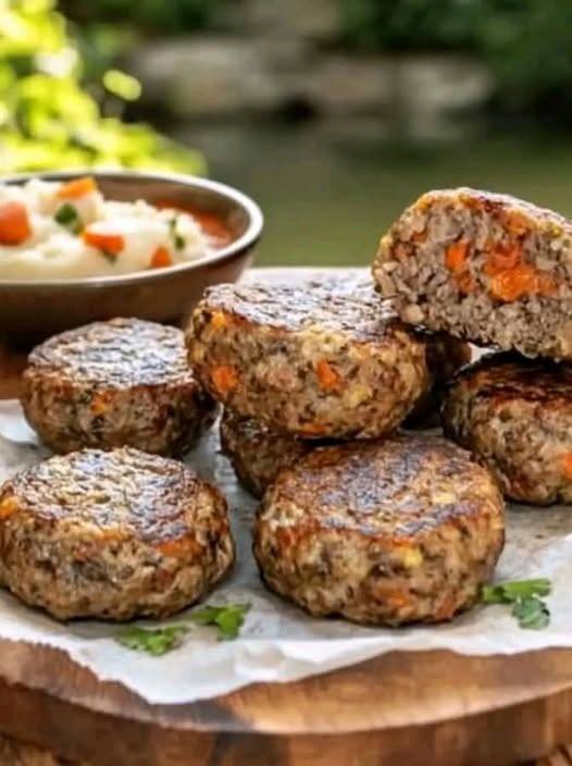 Składniki: Złociste, smażone na patelni australijskie kotlety wołowe z ziołami i sosem pomidorowym